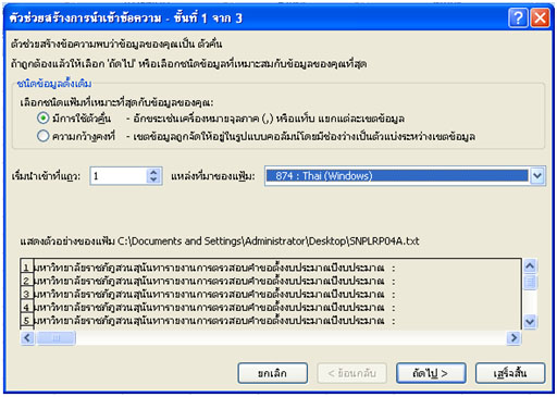 ขั้นที่ห้า เลือกแหล่งที่มาของแฟ้ม : เป็น 874 : Thai(Windows) แล้วกดปุ่ม ถัดไป