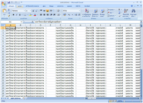 ![]() ท่านจะเห็นได้ว่า ข้อมูลจะอยู่ในรูปแบบของ Microsoft Excel แล้ว ในขั้นต่อไป ก็จะเป็นการปรับข้อมูลให้ตามความต้องการ และจะได้นำเสนอข้อมูลด้วย PivotTable ของ Microsoft Excel ซึ่งท่านผู้อ่านต้องไปหาความรู้ในเรื่องนี้เพิ่มเติม ในที่นี้ผู้เขียนขอเสนอตัวอย่างที่ผู้เขียนที่จัดทำไว้แล้ว